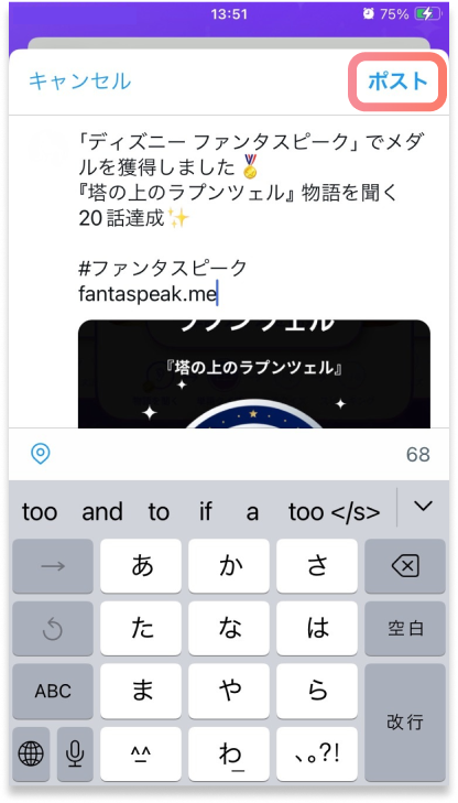 獲得したメダルをアプリ内のシェアボタンからそのまま投稿する